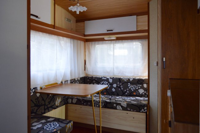Tavolo e panchette in un camper con finestre luminose e tendine bianche.