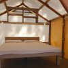 Tenda glamping con letto matrimoniale, illuminazione e struttura in legno.